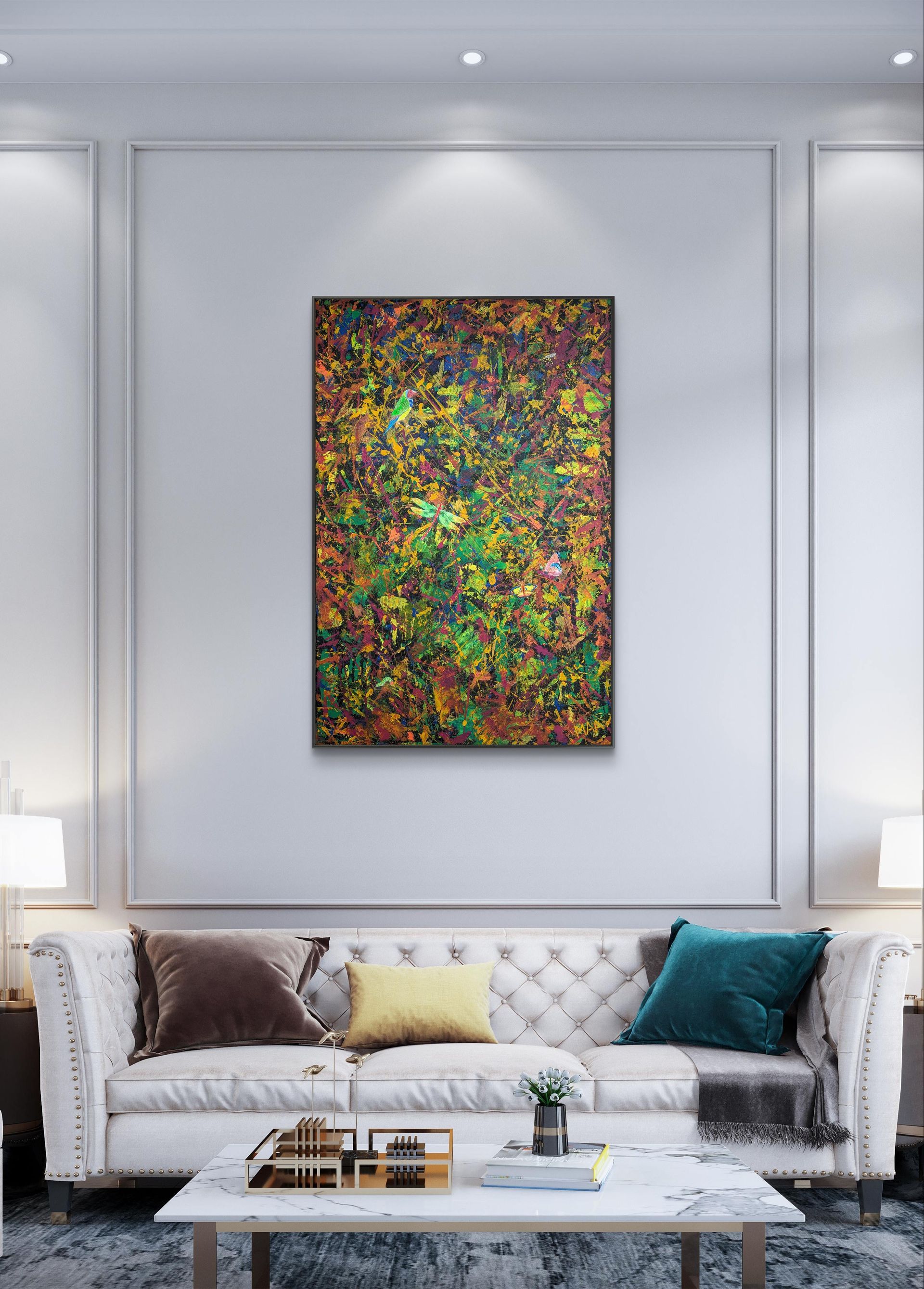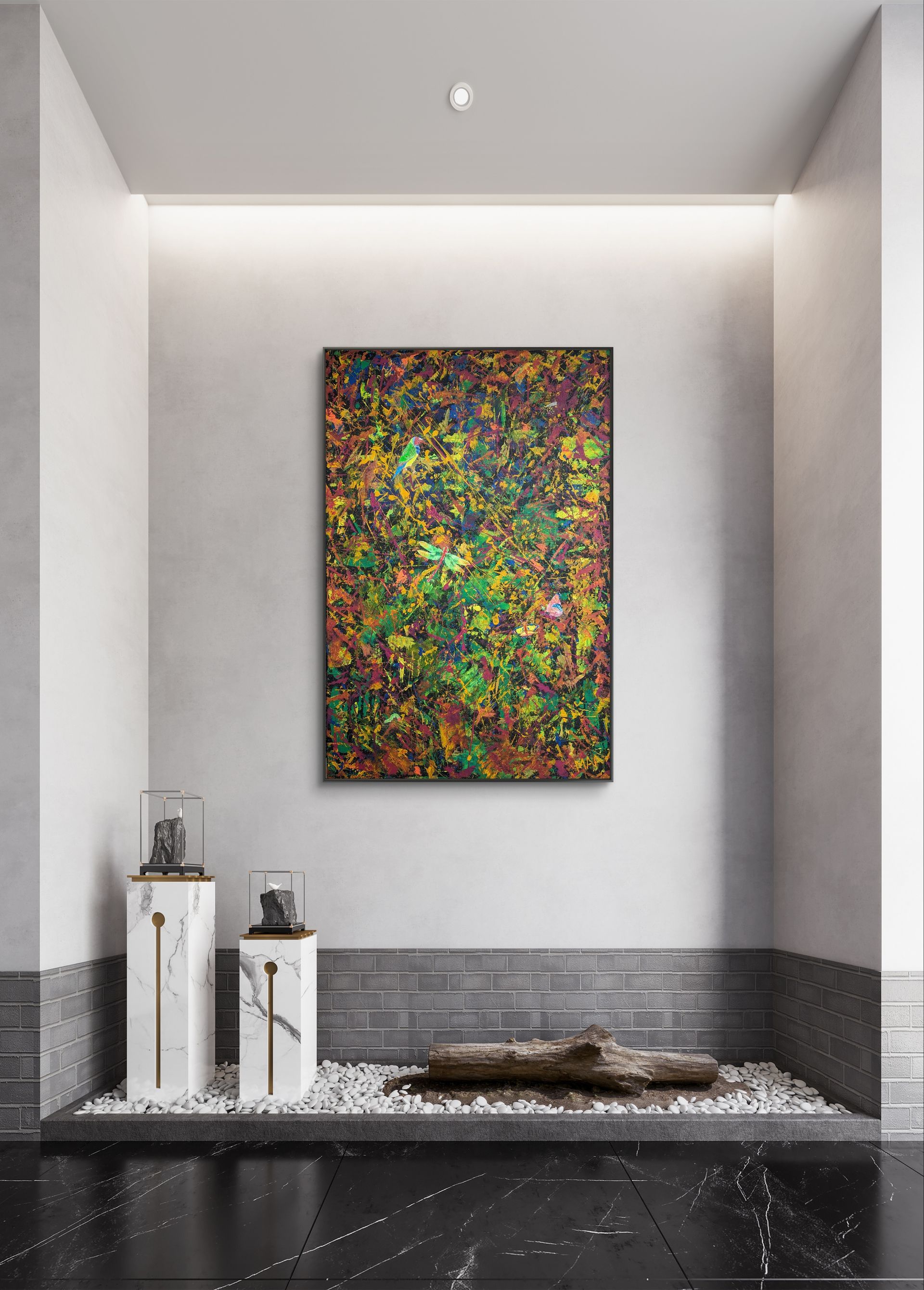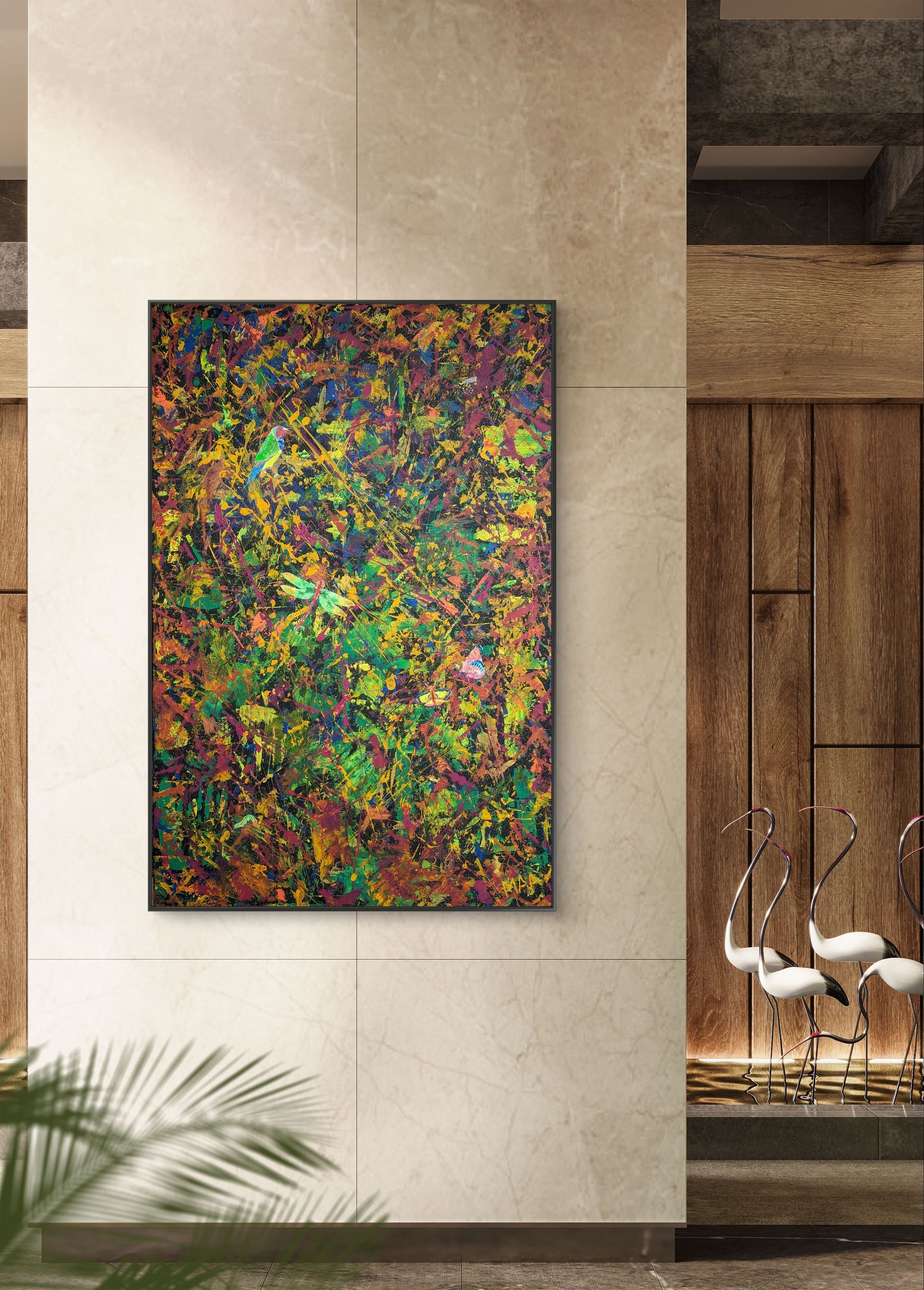 Ein leuchtendes Farbspiel aus Grün, Gelb und Rot, durchzogen von feinen Bewegungen der Natur. Zwischen den Schichten aus Acrylfarbe tauchen Vogel, Libelle und Schmetterling auf – Sinnbilder für Leben, Schöpfung und göttliche Ordnung im Chaos der Natur.Neuer Text