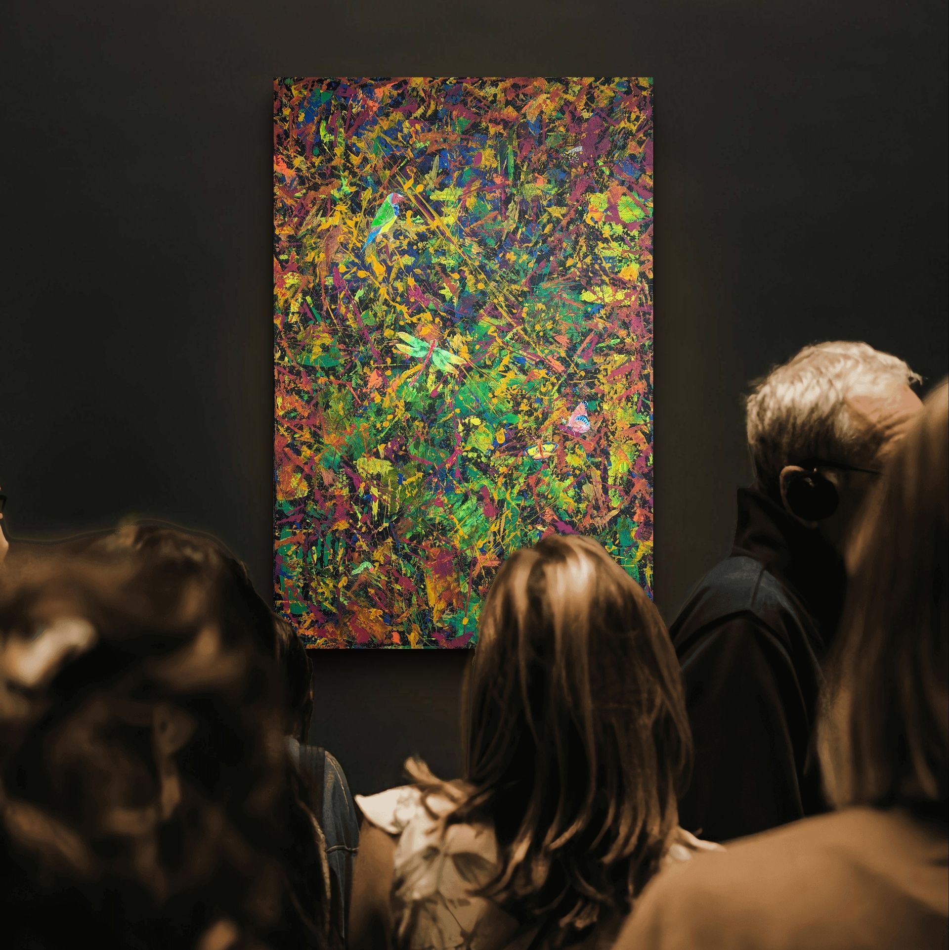 Zwischen den vibrierenden Linien und Strukturen werden zarte Gestalten sichtbar: ein Vogel, eine Libelle und ein Schmetterling. Sie stehen für Wandel, Leichtigkeit und die schöpferische Energie des Lebens.