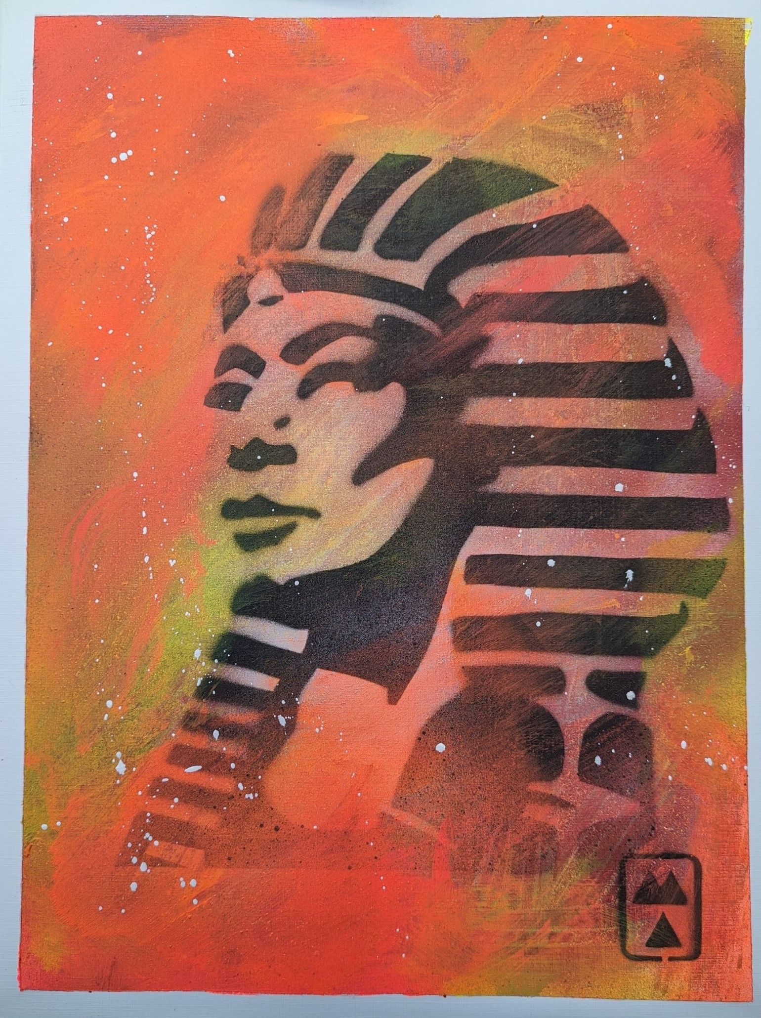Die feurigen Farbtöne – Orange, Rot und Gold – symbolisieren Sonne, Energie und Wiedergeburt. Schwarze, klare Linien erinnern an Hieroglyphen und heilige Wandbilder, während die gesprühte Textur eine Brücke zur Street-Art der Gegenwart schlägt.