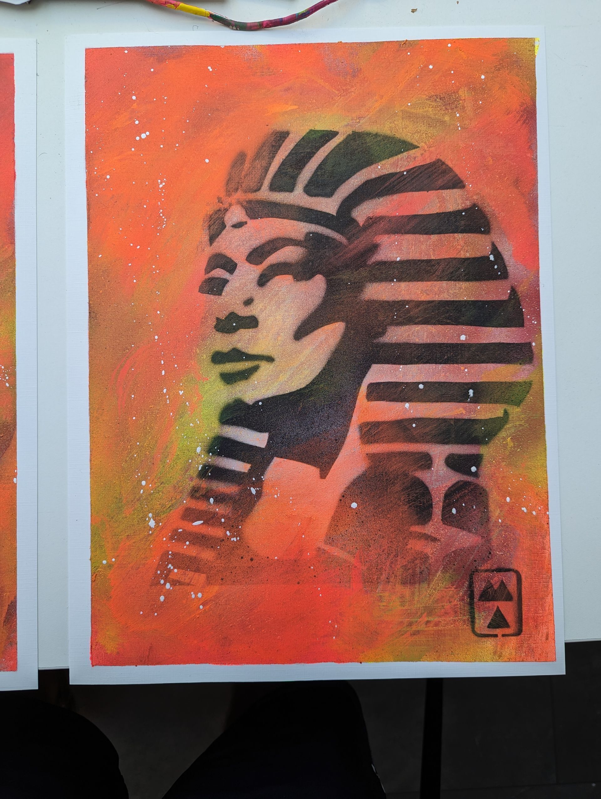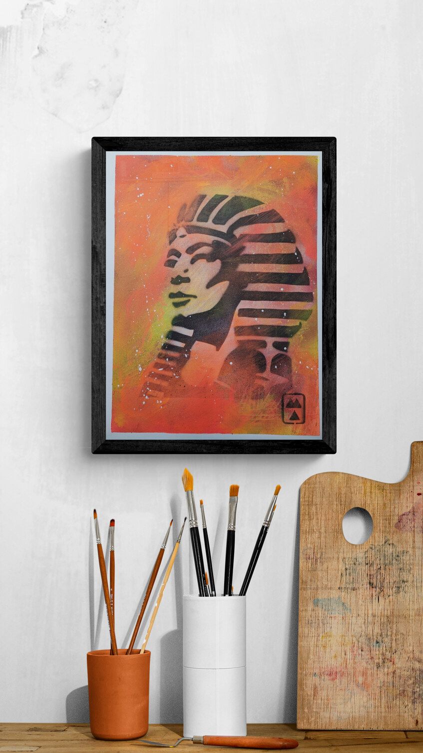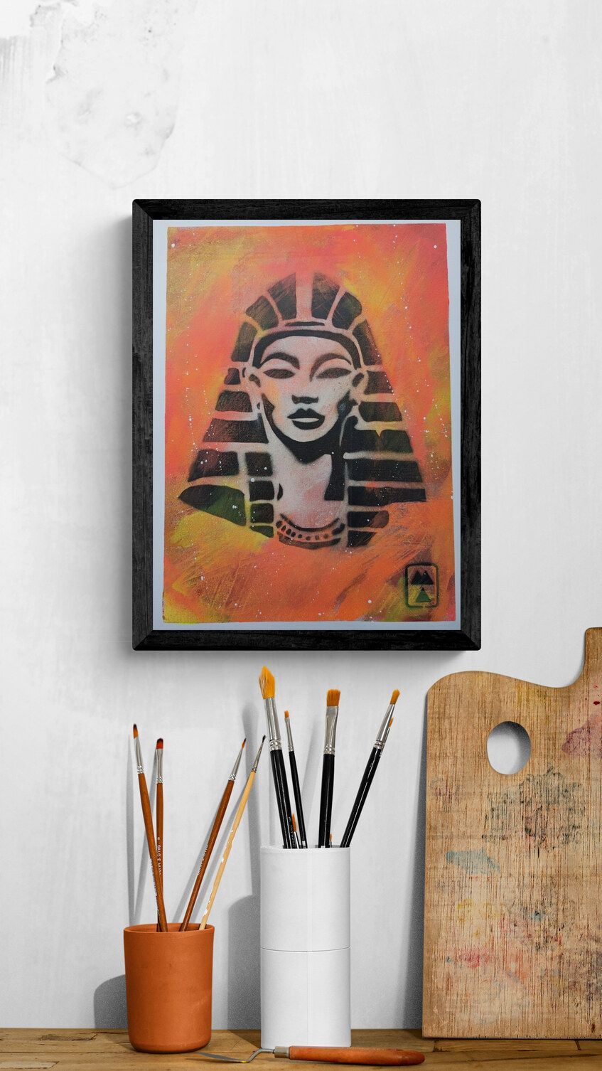 Mit Acryl- und Sprühfarben werden ikonische Porträts altägyptischer Herrscherfiguren neu interpretiert – Nofretete, ein Pharao und eine ägyptische Königin – neu gedacht in einem modernen, beinahe urbanen Stil.