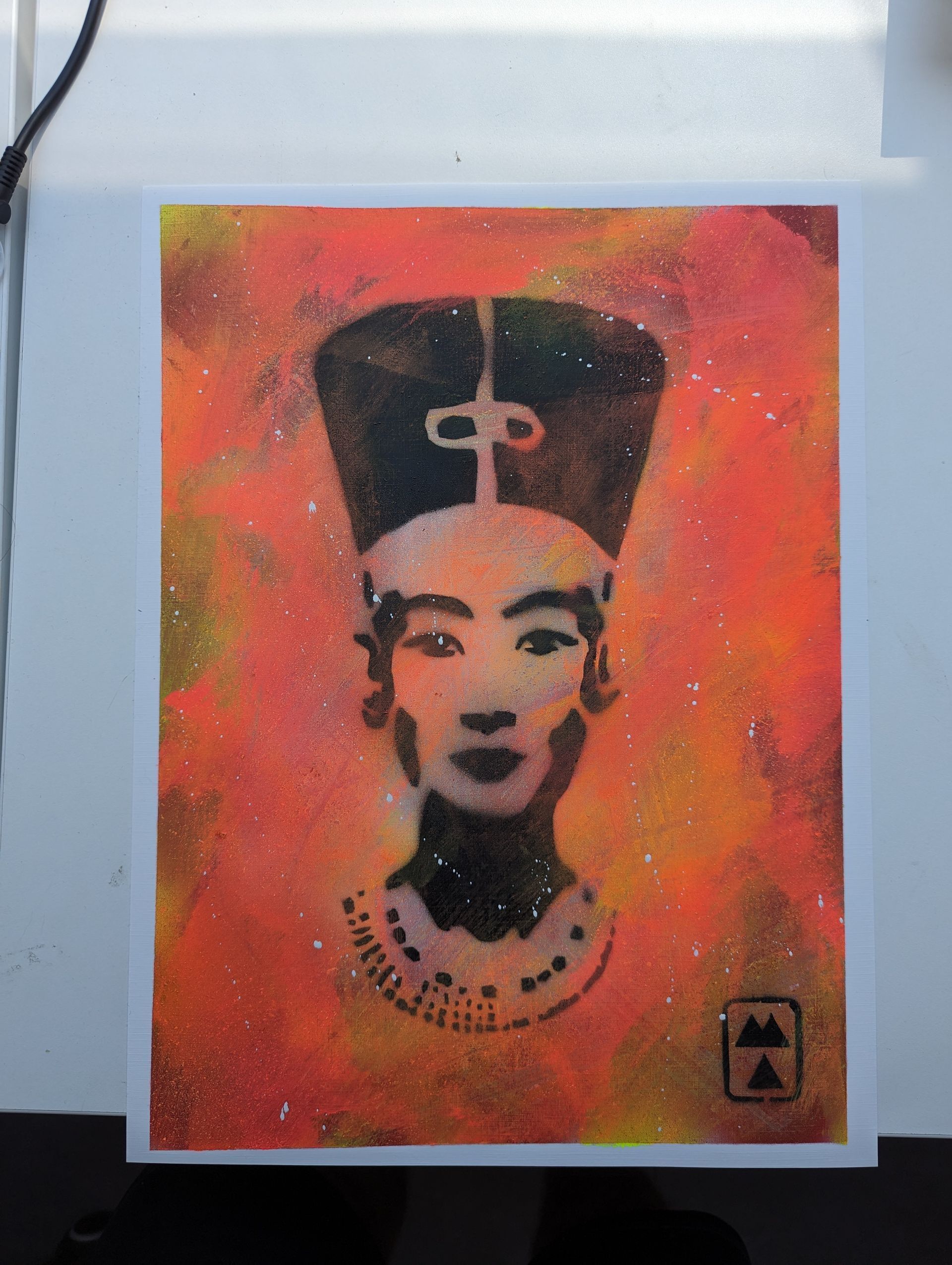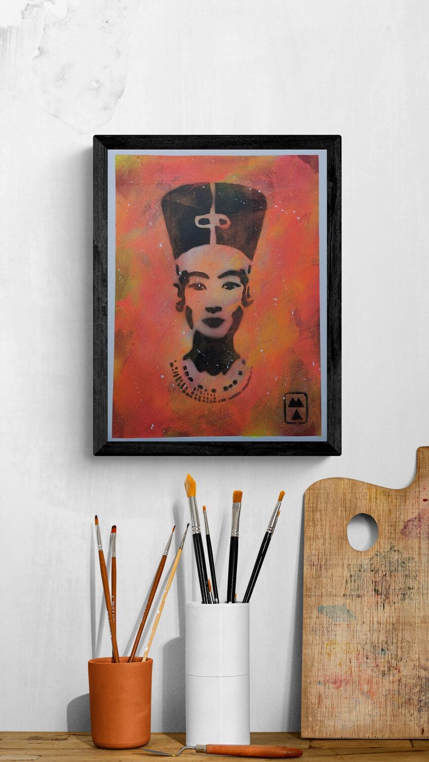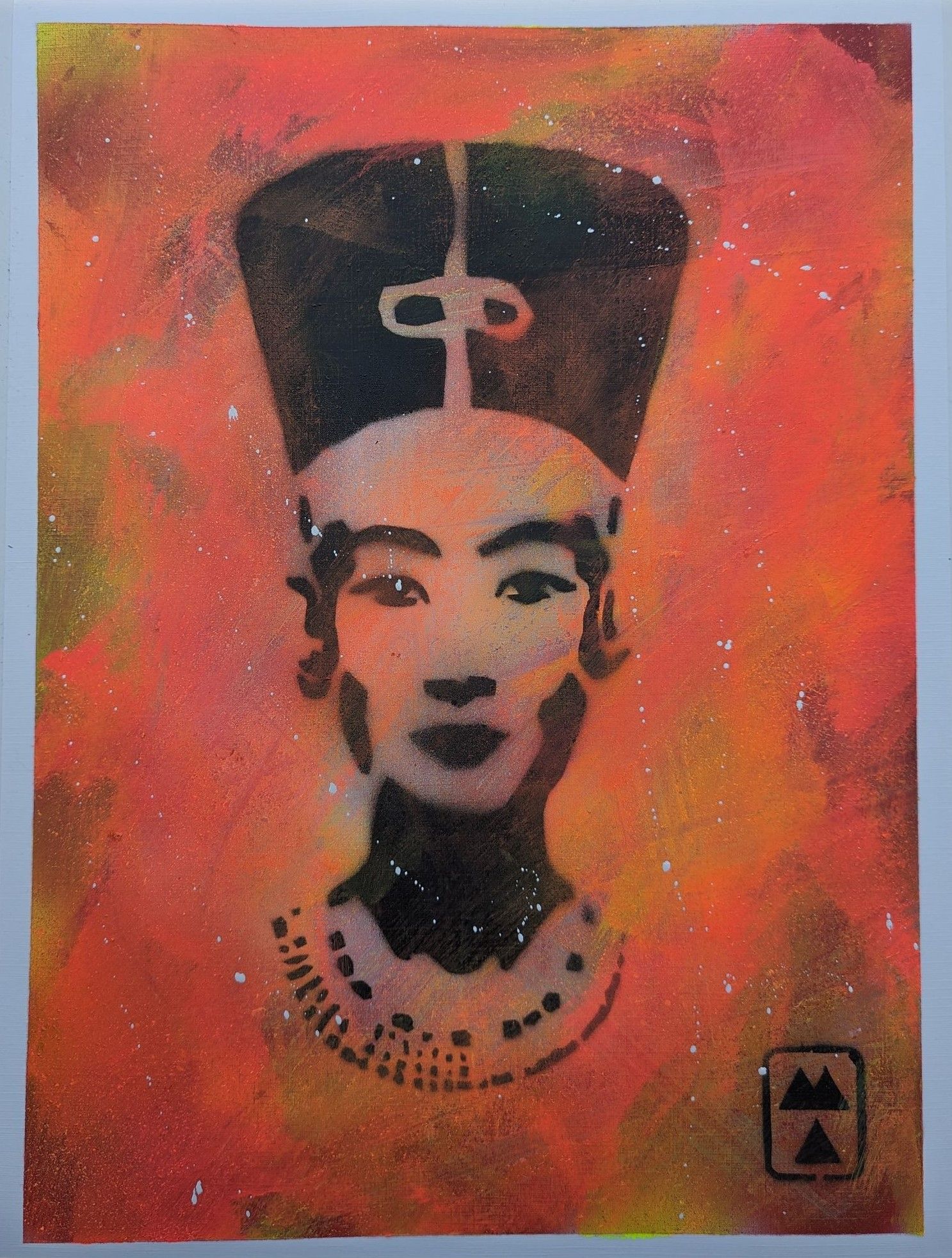 Mit Acryl- und Sprühfarben werden ikonische Porträts altägyptischer Herrscherfiguren neu interpretiert – Nofretete, ein Pharao und eine ägyptische Königin – neu gedacht in einem modernen, beinahe urbanen Stil.
