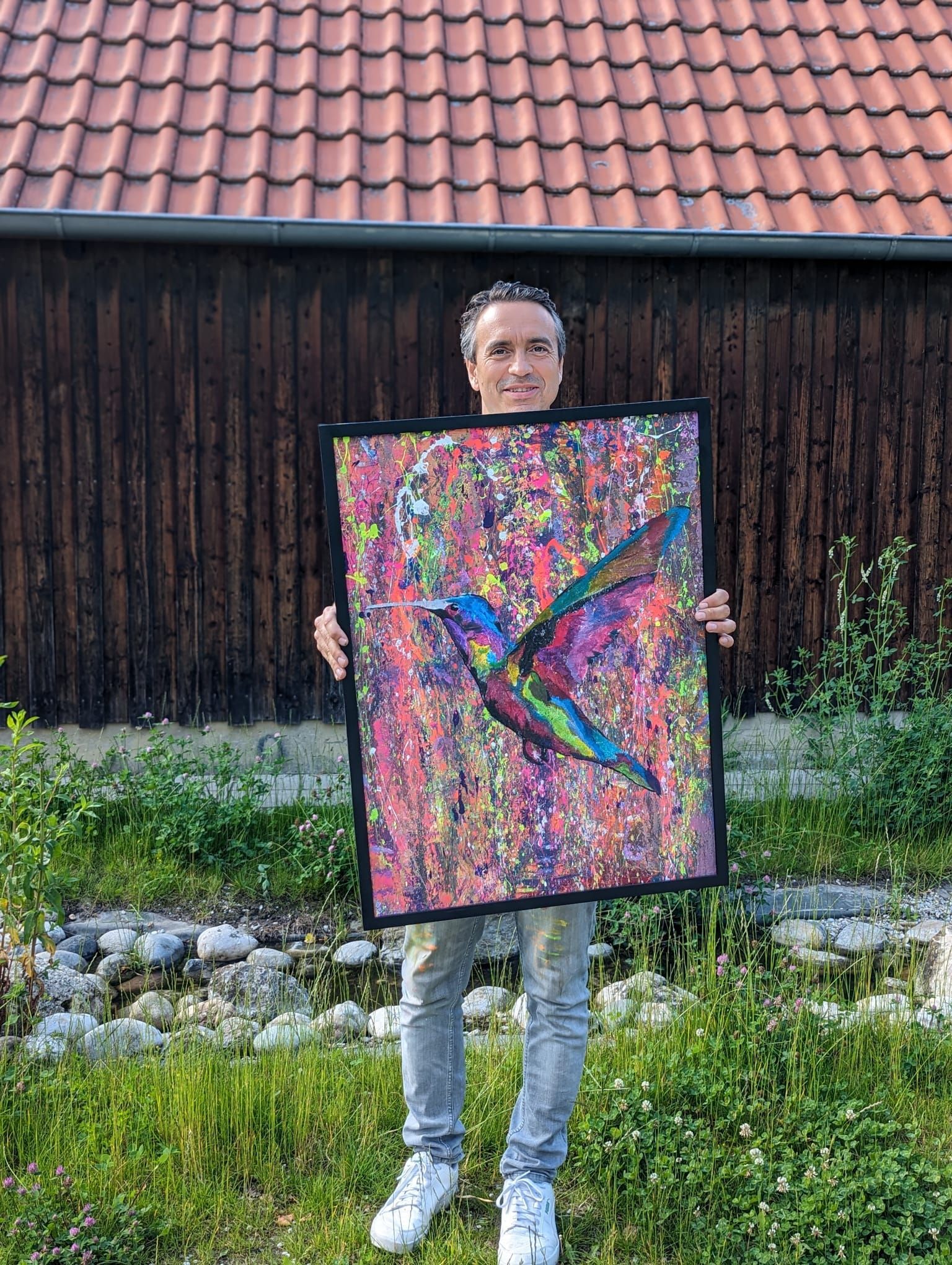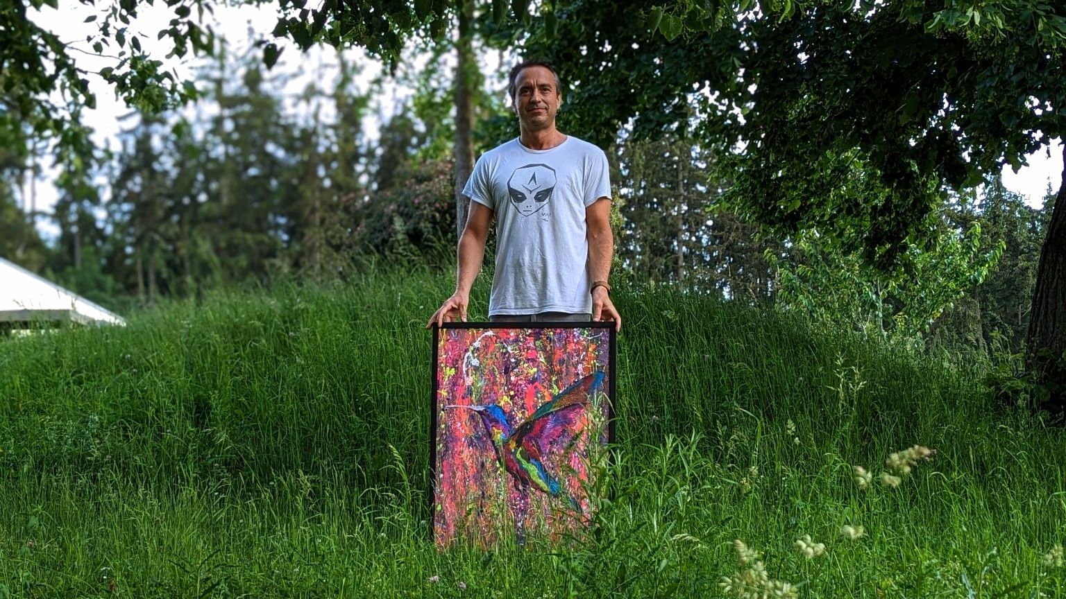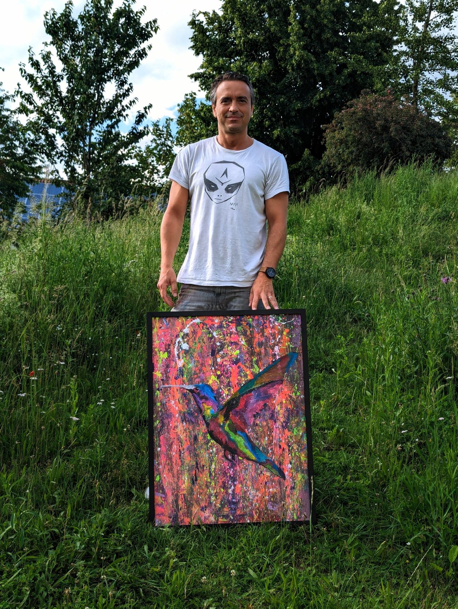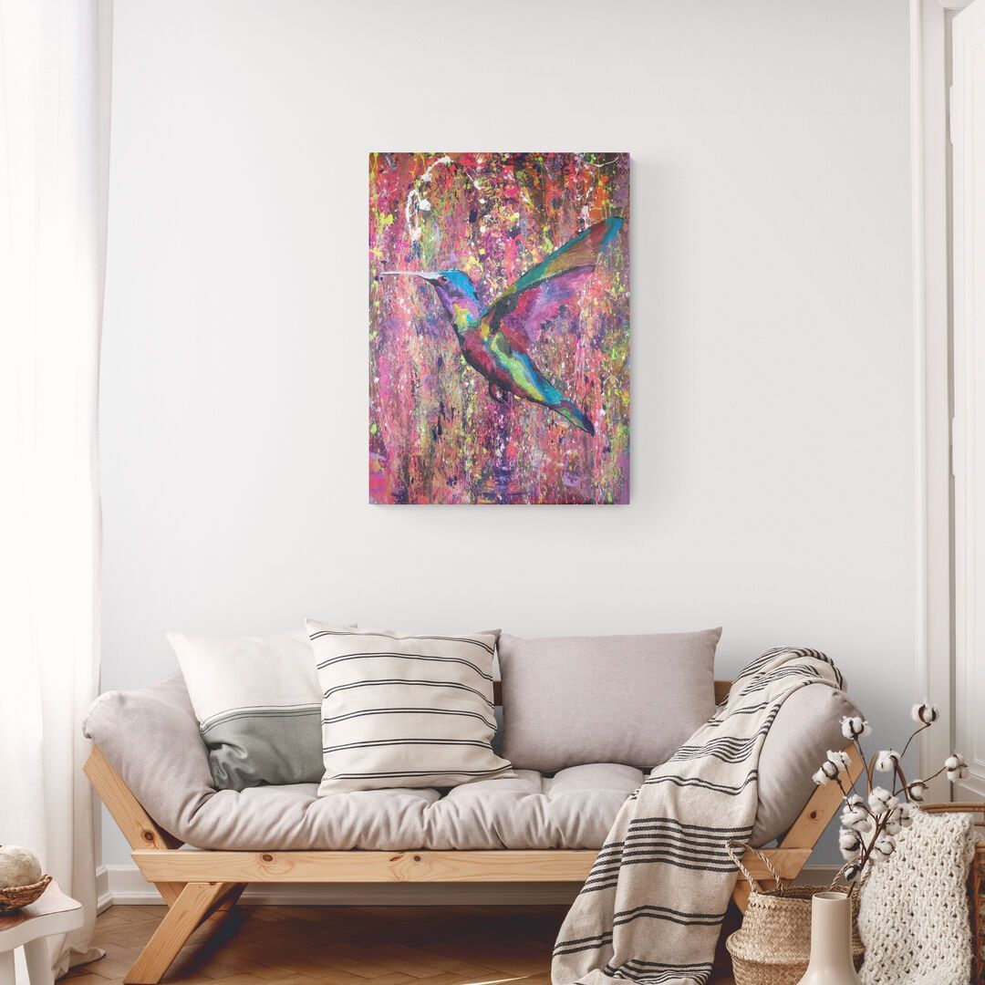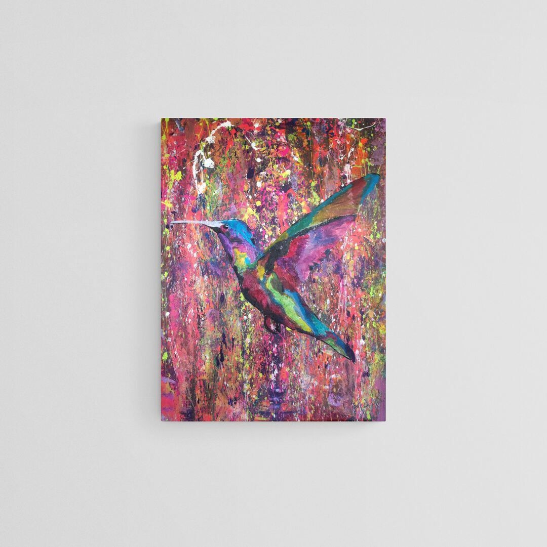 Im Zentrum steht ein Kolibri, der inmitten eines explosionsartigen Farbspiels aus Pink, Violett, Grün und Gold schwebt.