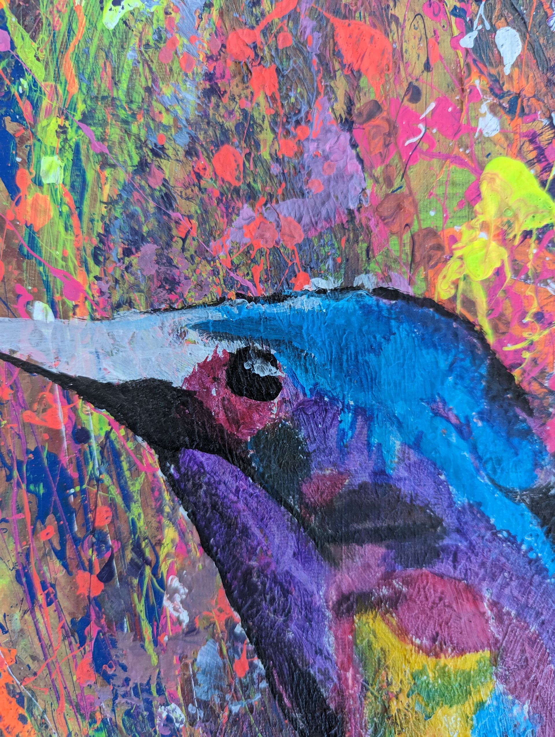 Der Kolibri steht als Symbol für Leichtigkeit, Lebensfreude und geistige Energie. Seine Schwingen reflektieren das Licht, während die Farbschichten Tiefe und Rhythmus erzeugen.