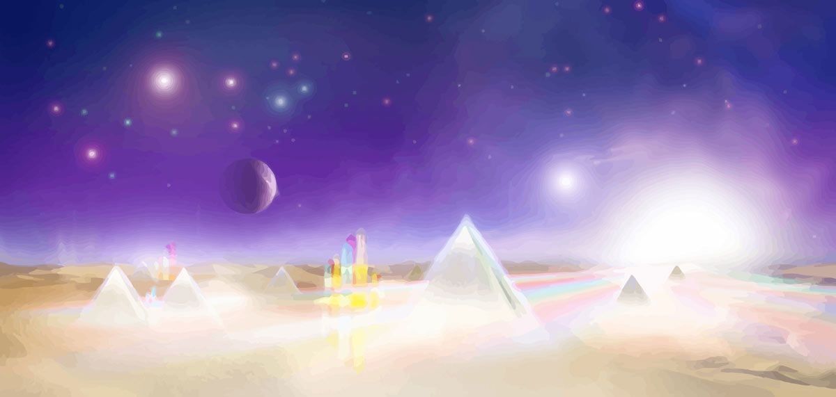 Ein visionäres Landschaftsmotiv aus Licht und Energie – Pyramiden, Sterne und sphärische Farben verbinden sich zu einem Bild zwischen Traum und Kosmos.Neuer Text